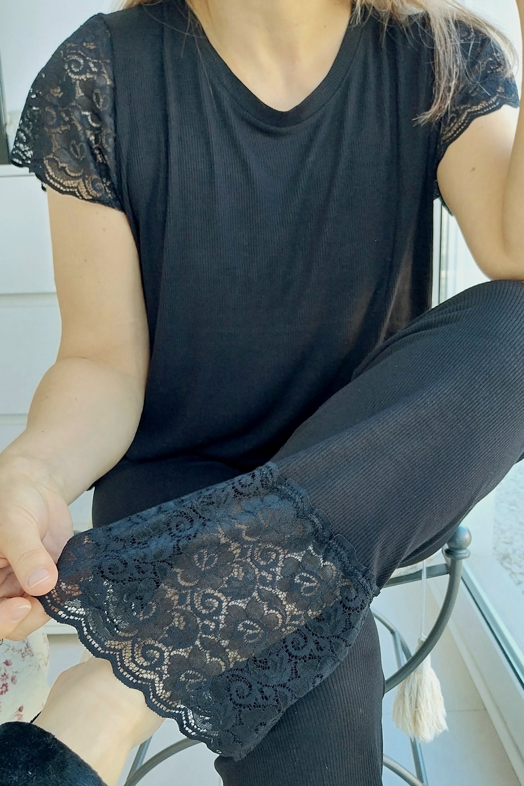 La remera tiene escote redondo, es de corte en evasé, tiene mangas cortas confeccionadas en una delicada puntilla.